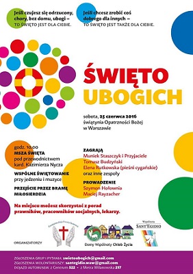 Pod koniec czerwca nasze Stowarzyszenie wraz z Kamiliańską Misją Pomocy Społecznej, Katolicką Wspólnotą Chleb Życia, Wspólnotą Sant’Egidio i innymi organizacjami współuczestniczyło w realizacji Święta Ubogich. Inicjatywa taka miała na celu umożliwienie spotkania osób ubogich, wykluczonych społecznie, organizacji pomocowych i warszawiaków. Uczestnicy (osoby bezdomne, ubogie, chore, w podeszłym wieku, samotne) mogli zjeść ciepły posiłek, skorzystać z porady lekarskiej, rozmowy z pracownikami socjalnymi, posłuchać muzyki, poczuć się we wspólnocie.